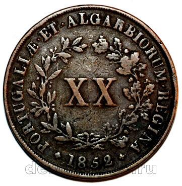 Монета 20 рейс 1852 года Королева Мария II, Королевство Португалия.
