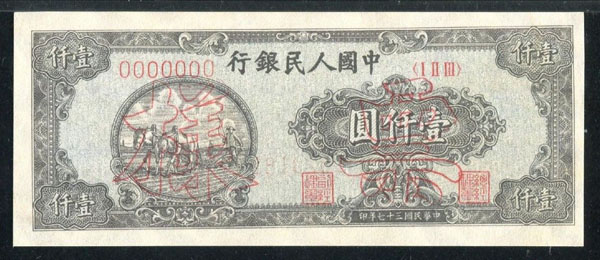 Народный банк Китая 1000 юаней 1948 года ОБРАЗЕЦ Pick 810.